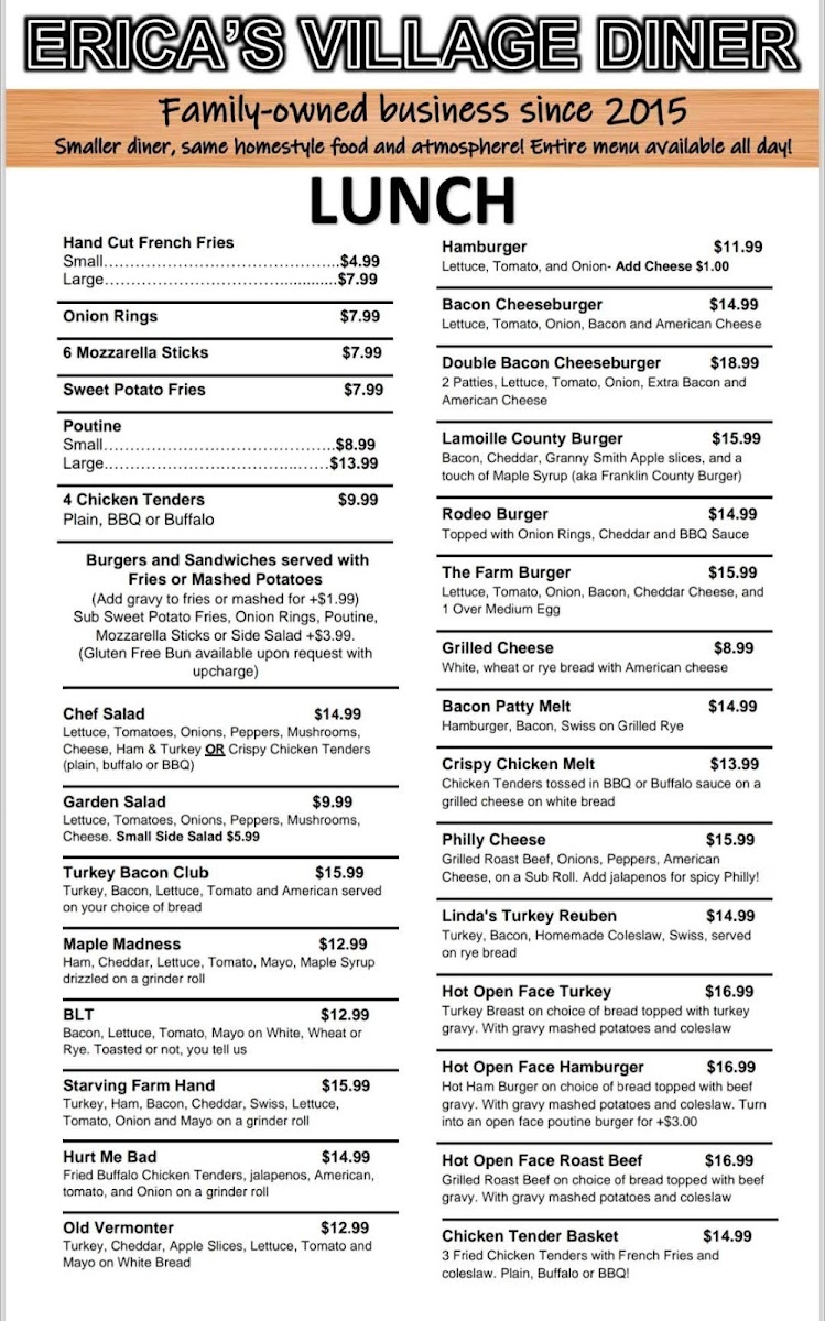 Whether you’re stopping by for a quick breakfast or enjoying a leisurely lunch, the Erica’s Village Diner Menu is packed with delicious, comforting choices that make every visit a treat. Its focus on local ingredients and classic diner fare ensures that each meal feels like a home-cooked experience.