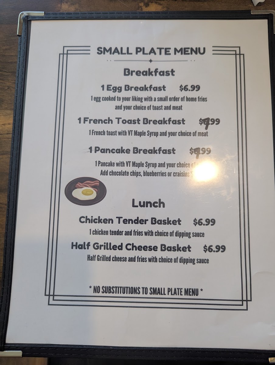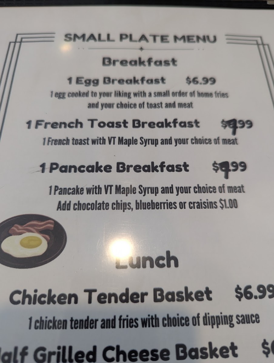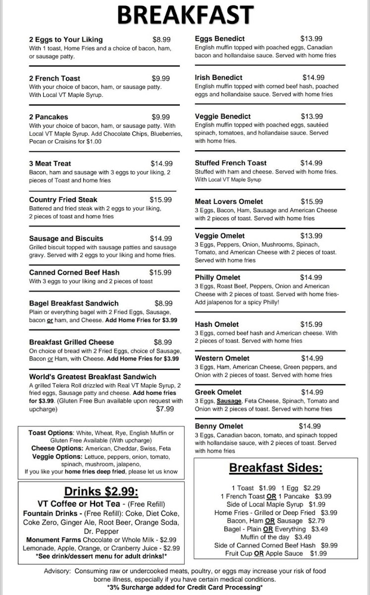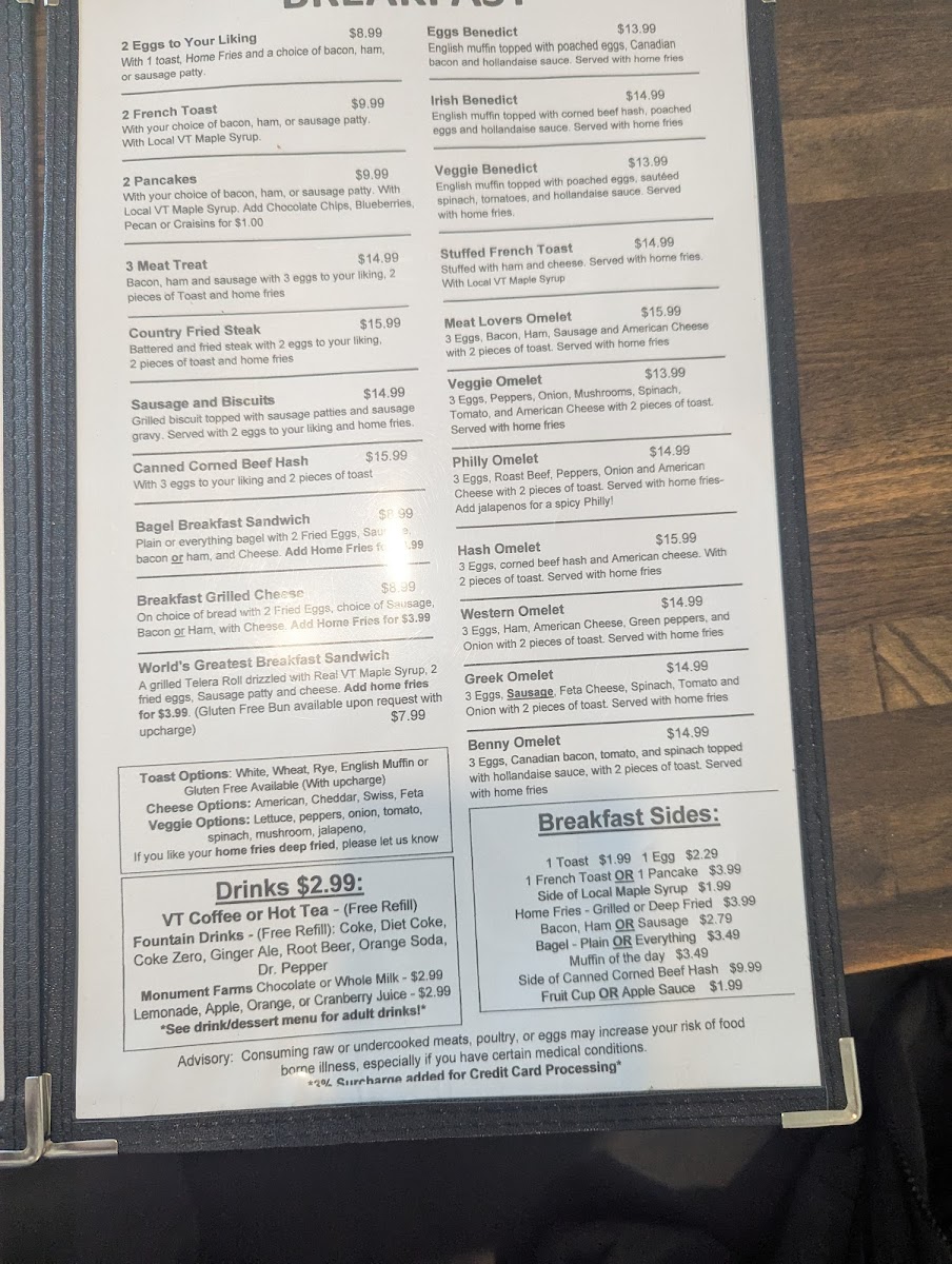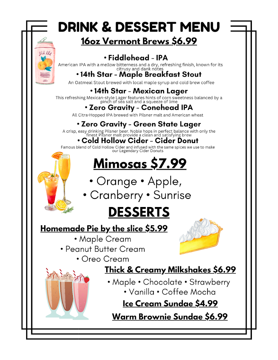 To accompany your meal, the drinks menu includes local favorites like VT Coffee, which offers a rich, aromatic brew, and Monument Farms Chocolate, a smooth, creamy beverage that’s perfect for anyone with a sweet tooth.