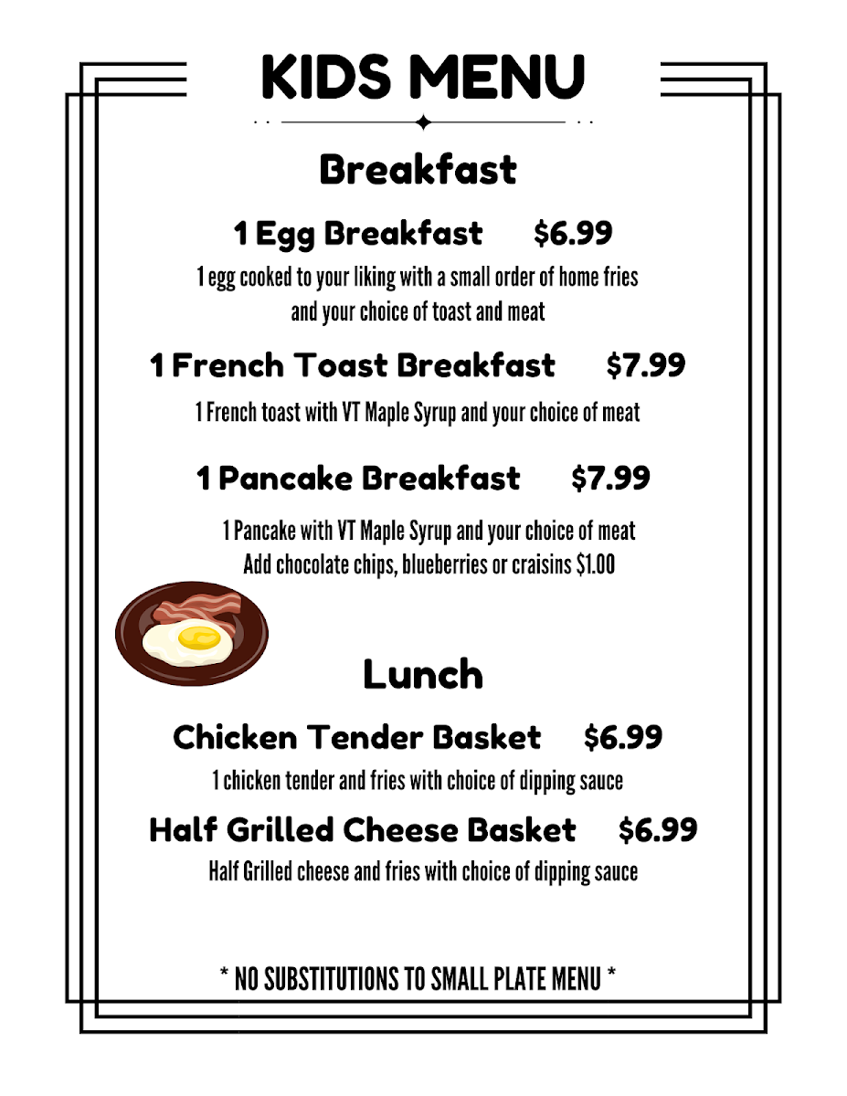Erica's Village Diner Menu offers a delightful, down-to-earth selection of comfort food that perfectly captures the cozy, welcoming atmosphere of this beloved spot in Cambridge, VT. For breakfast lovers, the menu features simple yet satisfying options like the 1 Egg Breakfast, 1 French Toast Breakfast, and 1 Pancake Breakfast. These classic choices are perfect for starting the day right, with sides like crispy home fries (available grilled or deep fried) and a side of local maple syrup that truly elevates the experience. If you're in the mood for something extra, the 1 Toast or 1 French Toast sides complement your meal beautifully.
